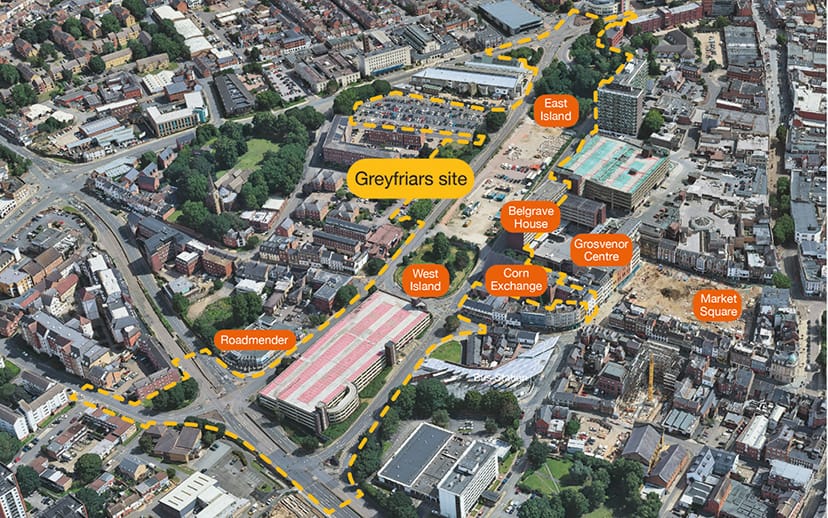 The 14-acre area includes the former bus station site, East and West Island, Mayorhold Multistorey Car Park, Belgrave House, Corn Exchange and Victoria Street Car Park.